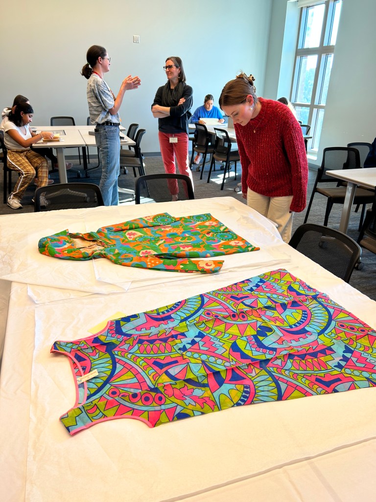 (Photo/Skyli Alvarez)Idacavage and her students look at vintage garments at the Richard B. Russell Special Collections Building on Monday, Feb. 6, 2023. By observing and touching historical garments, Idacavage encourages students to rethink their perceptions of slow versus fast fashion, especially in comparison to Community’s upcycled clothes.
