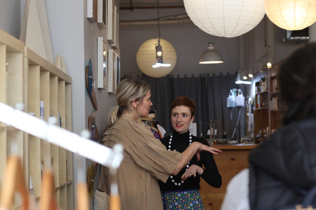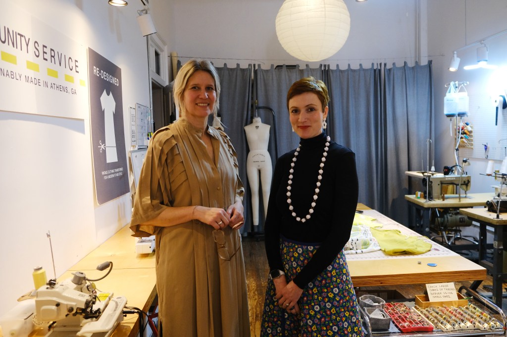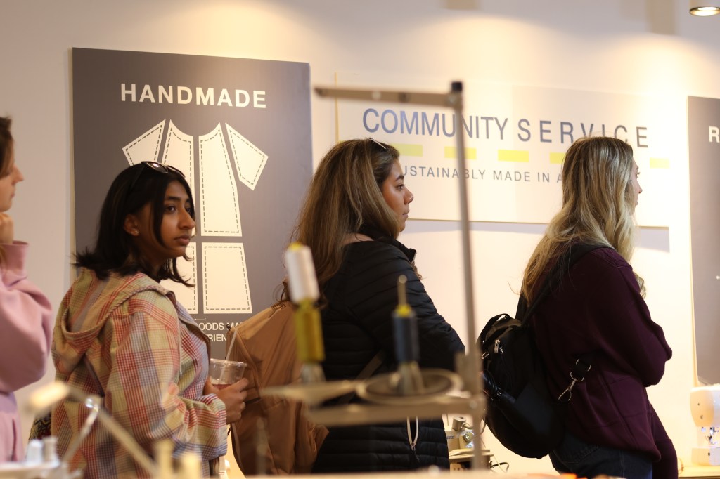 (Photo/Skyli Alvarez)Idacavage’s students listen to Baumgärtner and Haley Allen, a graduate student and Community seamstress, explain Community’s eco-conscious efforts on Friday, Feb. 17, 2023. The store aims to produce what it refers to as negative waste, using excess textile scraps to create small items like scrunchies or details on garments.