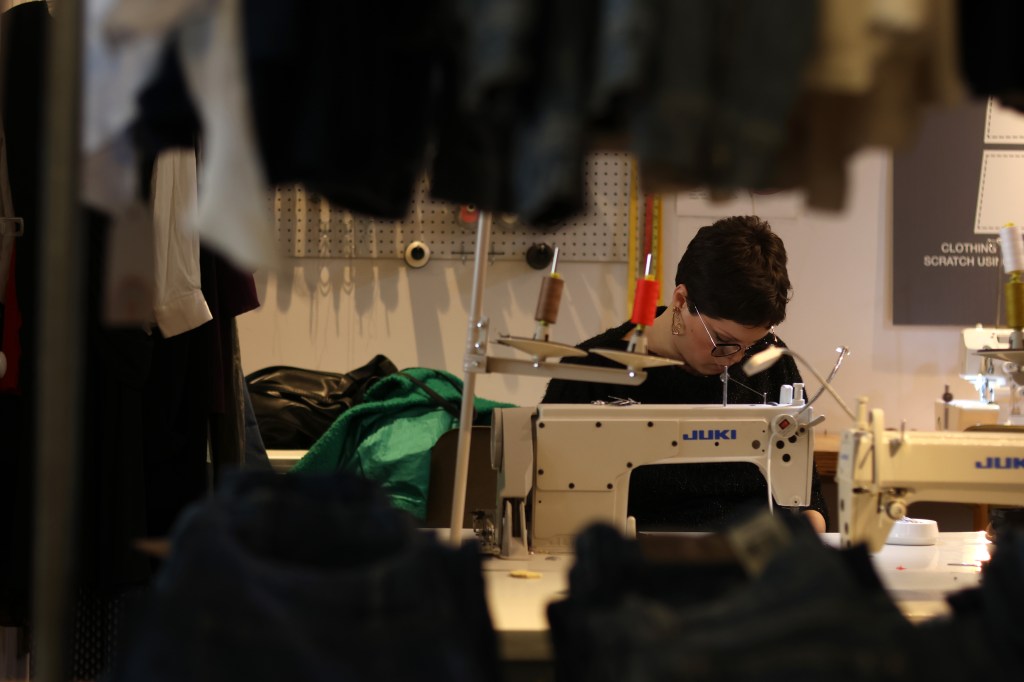 (Photo/Skyli Alvarez)While Baumgärtner talks to Idacavage’s students and reflects what they have learned in class, Allen works on alterations on Friday, Feb. 17, 2023. Allen explains how Community offers a variety of custom services, from adjusting the size of clothes to upcycling vintage or discarded garments for customers.